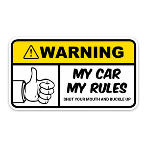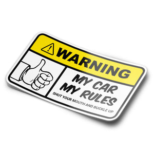 Assert your vehicular authority with our cheeky "My Car My Rules" sticker! Perfect for letting passengers know who's boss in your four-wheeled domain. This durable, weather-resistant decal adds personality to your ride while establishing the pecking order. Stick it on your dashboard, window or bumper for maximum impact. A must-have for drivers who like to maintain control of their automotive kingdom!